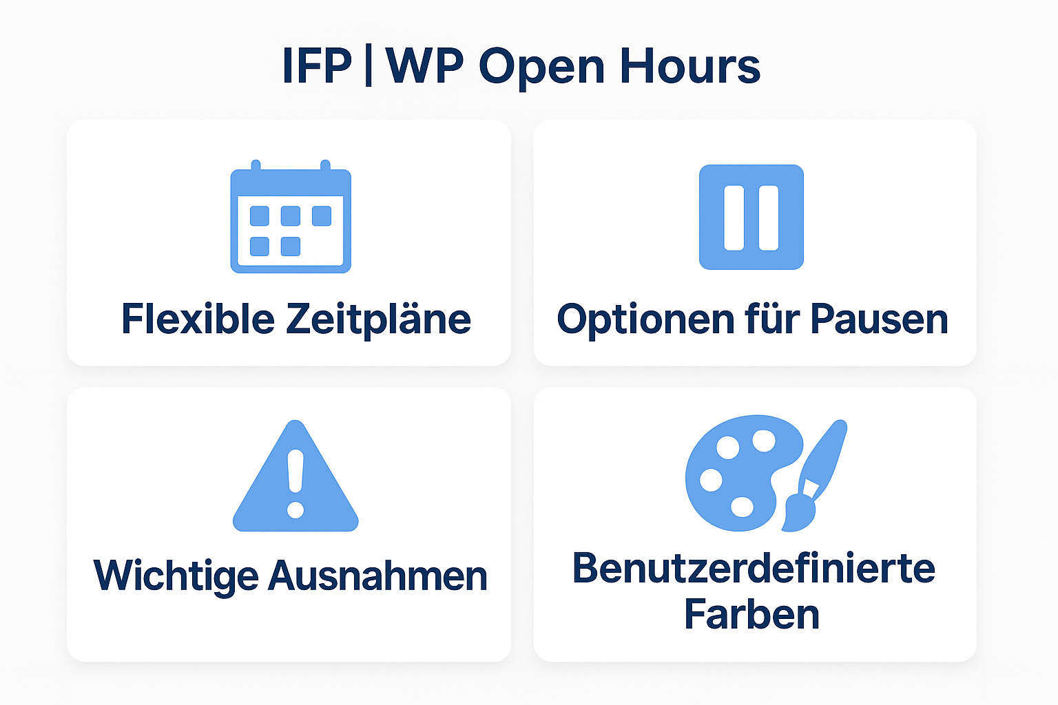 Verwalte Öffnungszeiten mit mehreren Zeitfenstern pro Tag, Pausen und Urlaubszeiträumen. Zeige „Jetzt geöffnet/geschlossen“ oder die ganze Wochenübersicht – mit konfigurierbaren Farben. Ideal für Seitenleisten, Kontaktseiten und Startseiten.
