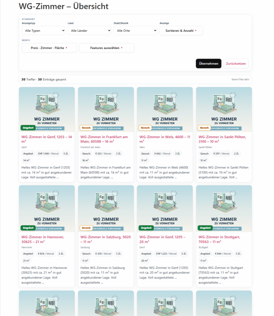 IFP WG Rooms ist ein schlankes WordPress-Plugin für die Vermittlung von WG-Zimmern und Wohnungsgesuchen in Deutschland, Österreich und der Schweiz. Es bringt einen eigenen Post-Typ, flexible Filter (Preis, Größe, Features), Radius-Suche mit Geodaten, Favoriten, Statistiken und e