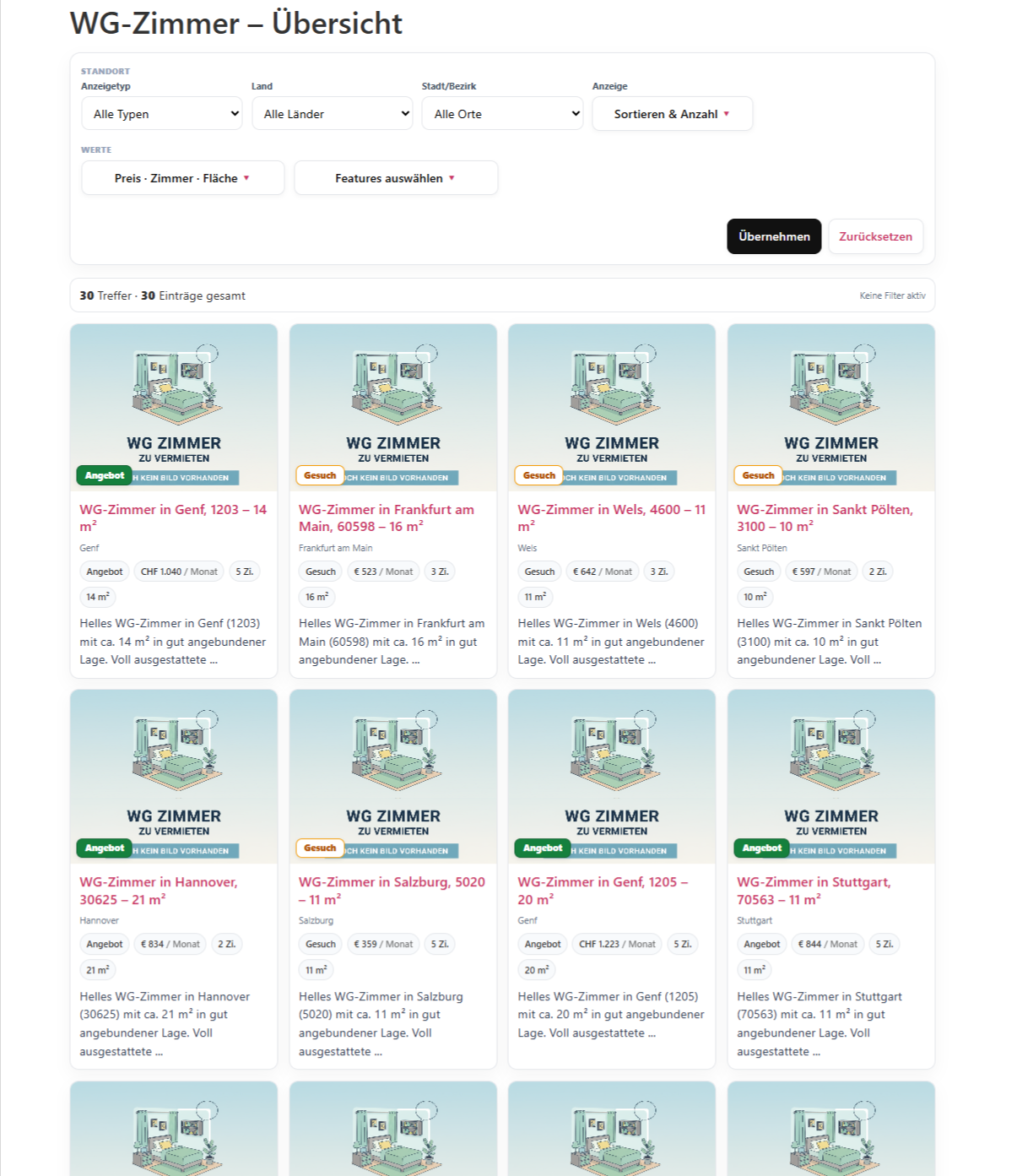 Herausforderung – WG-Portale und Kleinanzeigen sind oft unübersichtlich: Filter fehlen, Inserate bleiben trotz Ablauf sichtbar, und die Kommunikation läuft quer über viele Kanäle. Admins wünschen sich ein eigenes, fokussiertes System mit Kontrolle über Daten, Darstellung und Prozesse.