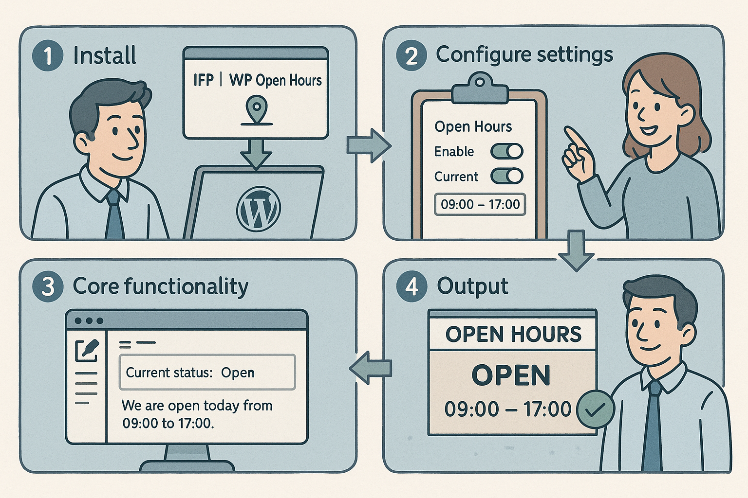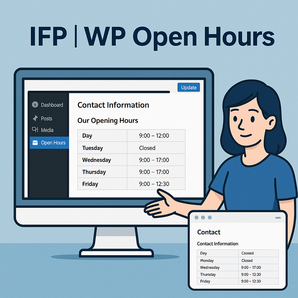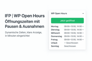 Lösung – IFP | WP Open Hours verwaltet Tageszeiten inkl. Pausen sowie Ausnahmen (z. B. Urlaub/Feiertage). Auf der Website wird ein Status-Button „Jetzt geöffnet/geschlossen“ ausgegeben; optional blendet sich darunter die Wochenübersicht ein. Farben der Anzeige sind im Backend einstellbar.